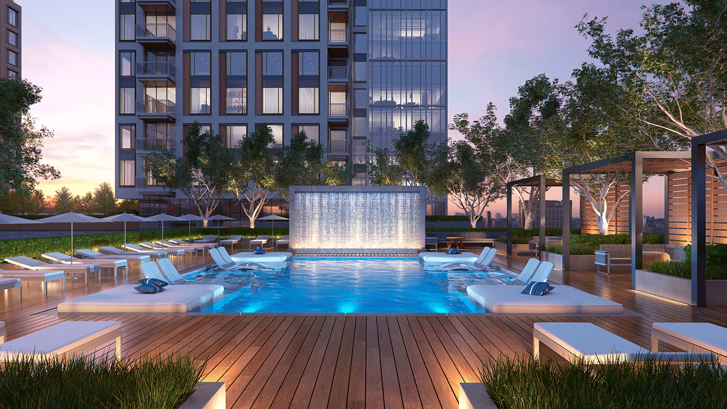 Approximately 70 percent of the residences will have step-out balconies, or “Juliet balconies,” with safety railings and inward-opening doors, said Rebecca Mattson, Cottonwood Management’s head of East Coast development. Penthouse units on the 18th through 20th floors, with prices topping $5 million, will have their private terraces. City regulators’ requirement that developers show how buildings’ shadows will affect the surrounding neighborhood influenced the design of the towers and outdoor amenities, Mattson said.